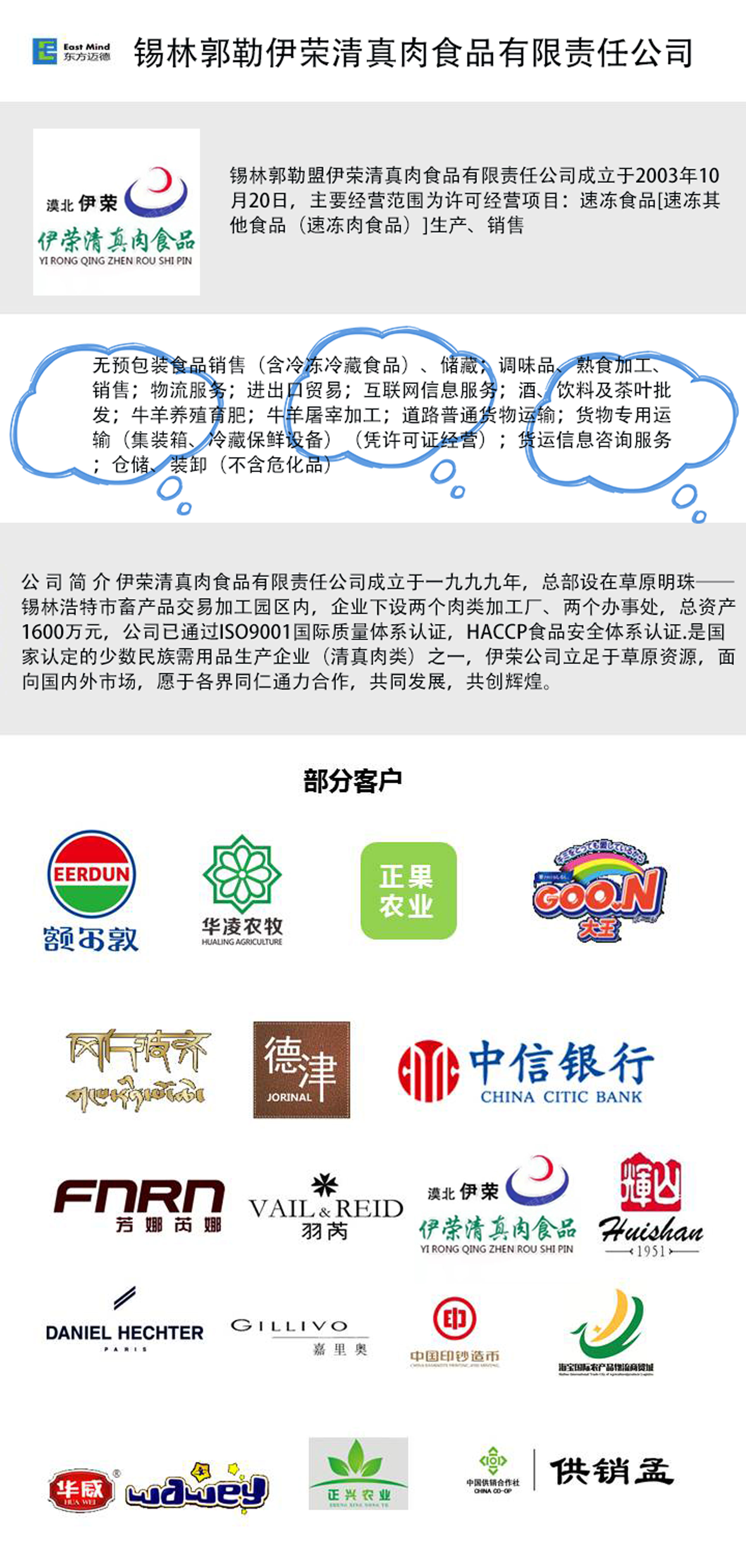 伊榮清真肉食品有限責任公司成立于一九九九年,總部設在草原明珠——錫林浩特市畜產品交易加工園區內,企業下設兩個肉類加工廠、兩個辦事處,總資產1600萬元,公司已通過ISO9001國際質量...