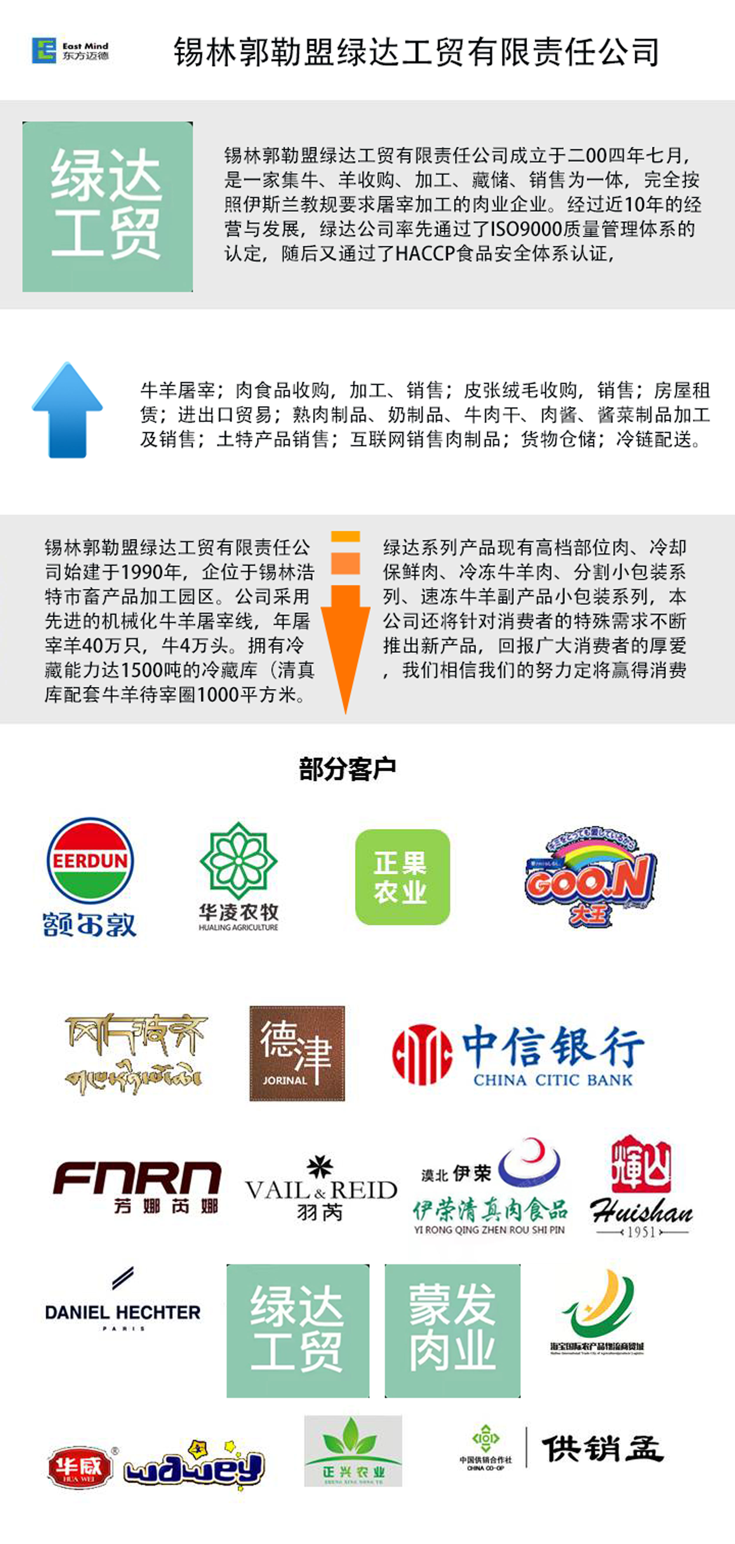 錫林郭勒盟威遠畜產品有限責任公司成立于2004年8月,是一家集牛羊屠宰、加工、冷藏、銷售為一體的現代化大型企業,年生產加工羔羊100萬只,肉制品年產量1萬噸。...